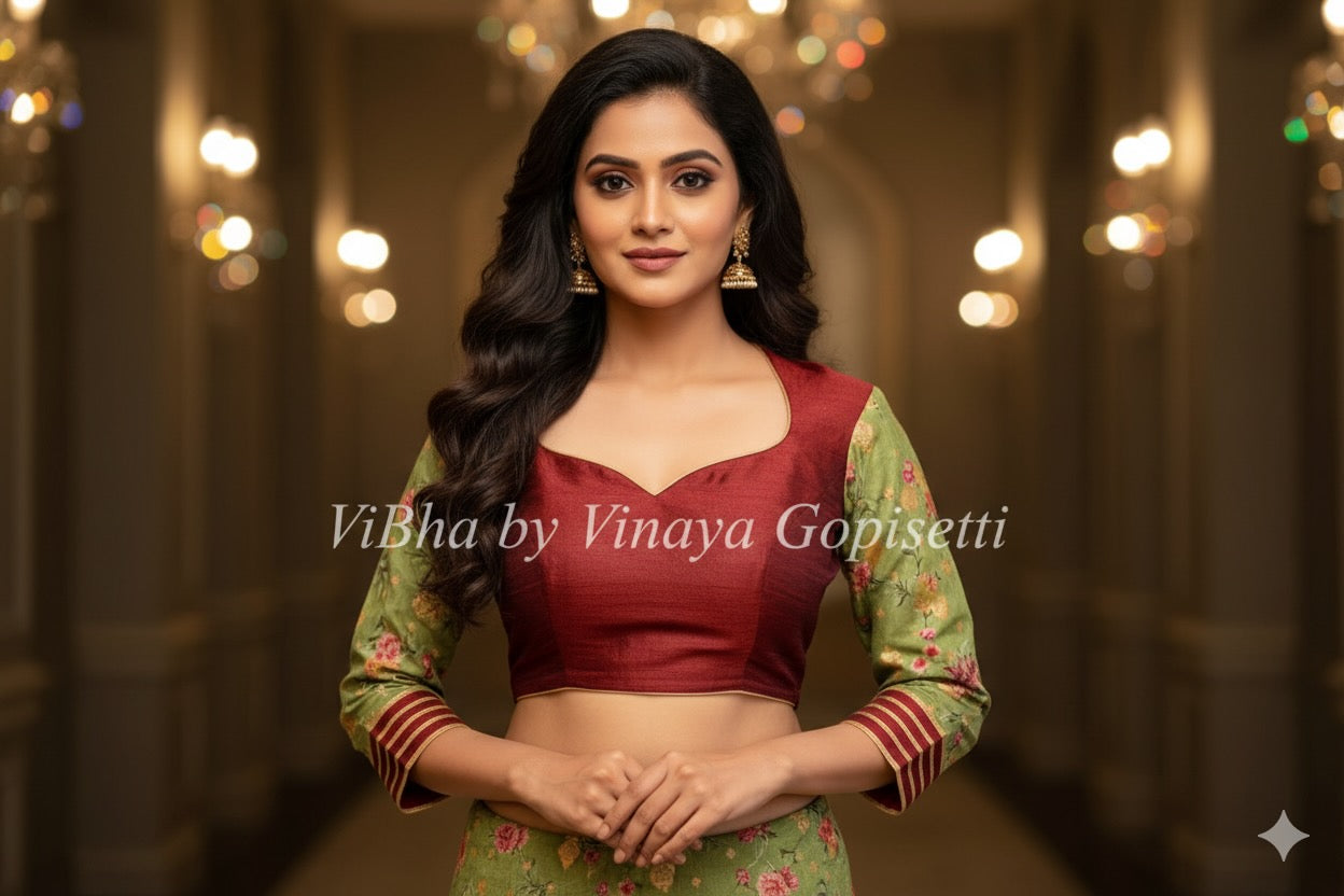 Indulge in luxurious elegance with our exquisite Maroon Hand Painted Blouse. Adorned with delicate embroidery and floral sleeves, this high-necked masterpiece is a work of art. Hand-painted by skilled women, the light green floral details add a touch of sophistication to your wardrobe..