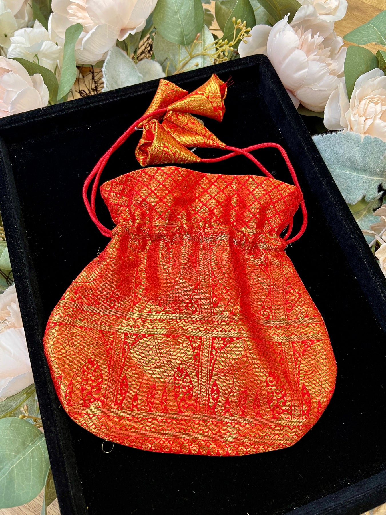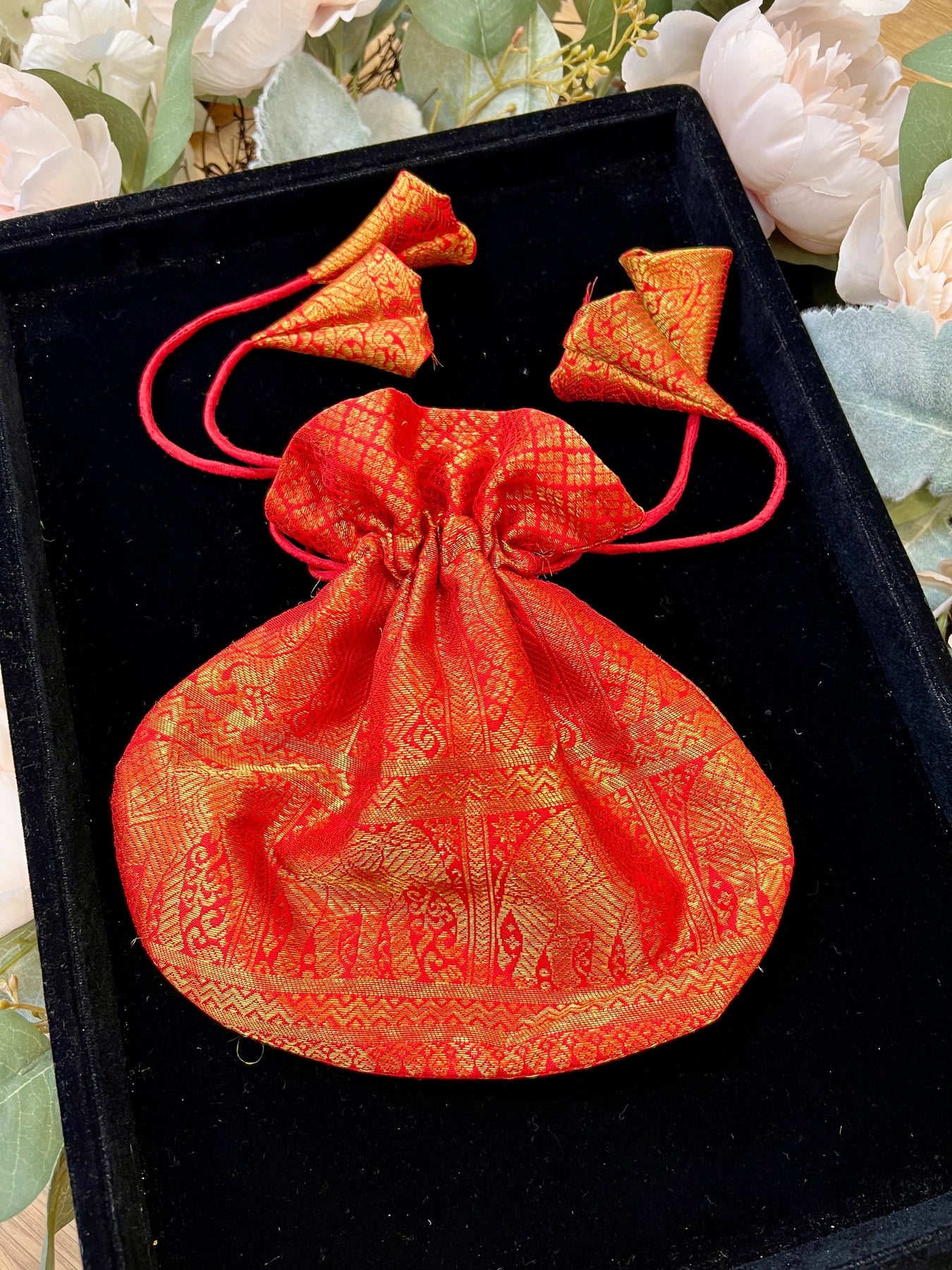 Elevate your evening ensemble with this striking red silk potli bag, a timeless accessory rooted in Indian craftsmanship. Crafted from luxurious silk fabric, this drawstring pouch features traditional potli construction with an elegant gathered top and secure closure. The rich red hue complements both festive wear and contemporary formal attire. Perfect for weddings, celebrations, or upscale events, this versatile piece holds essentials while adding sophisticated cultural flair to your look. An investment in refined style that transcends seasonal trends.