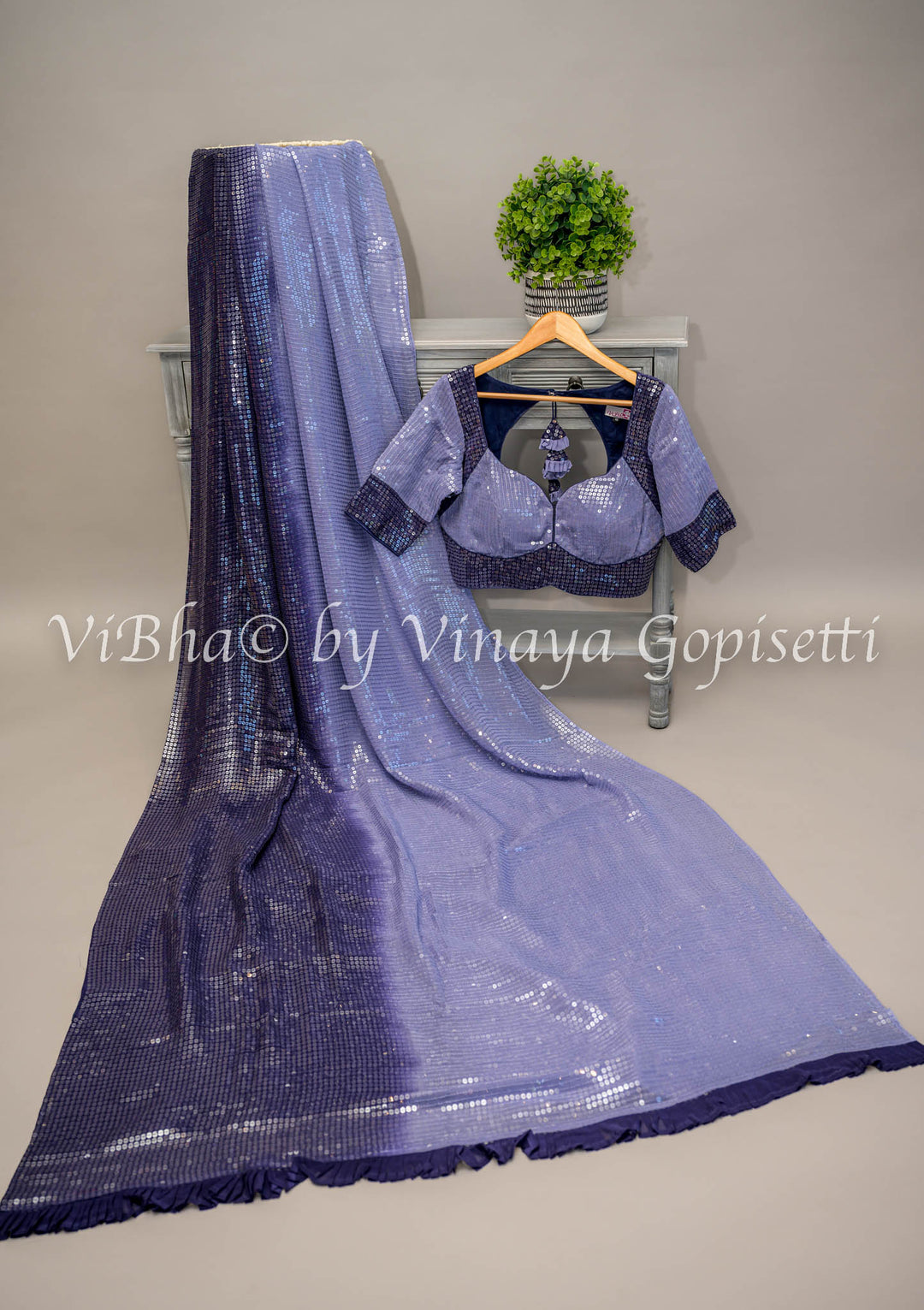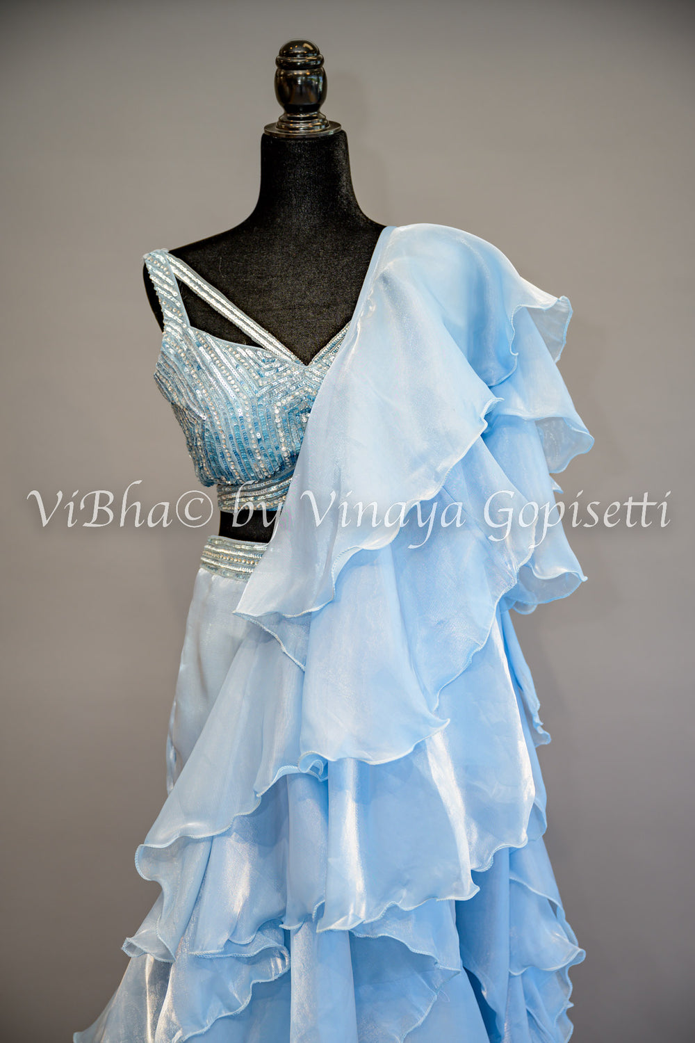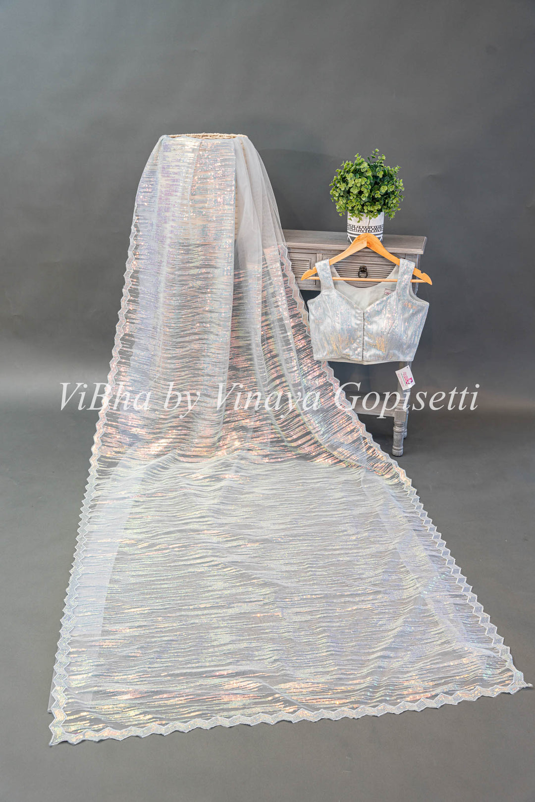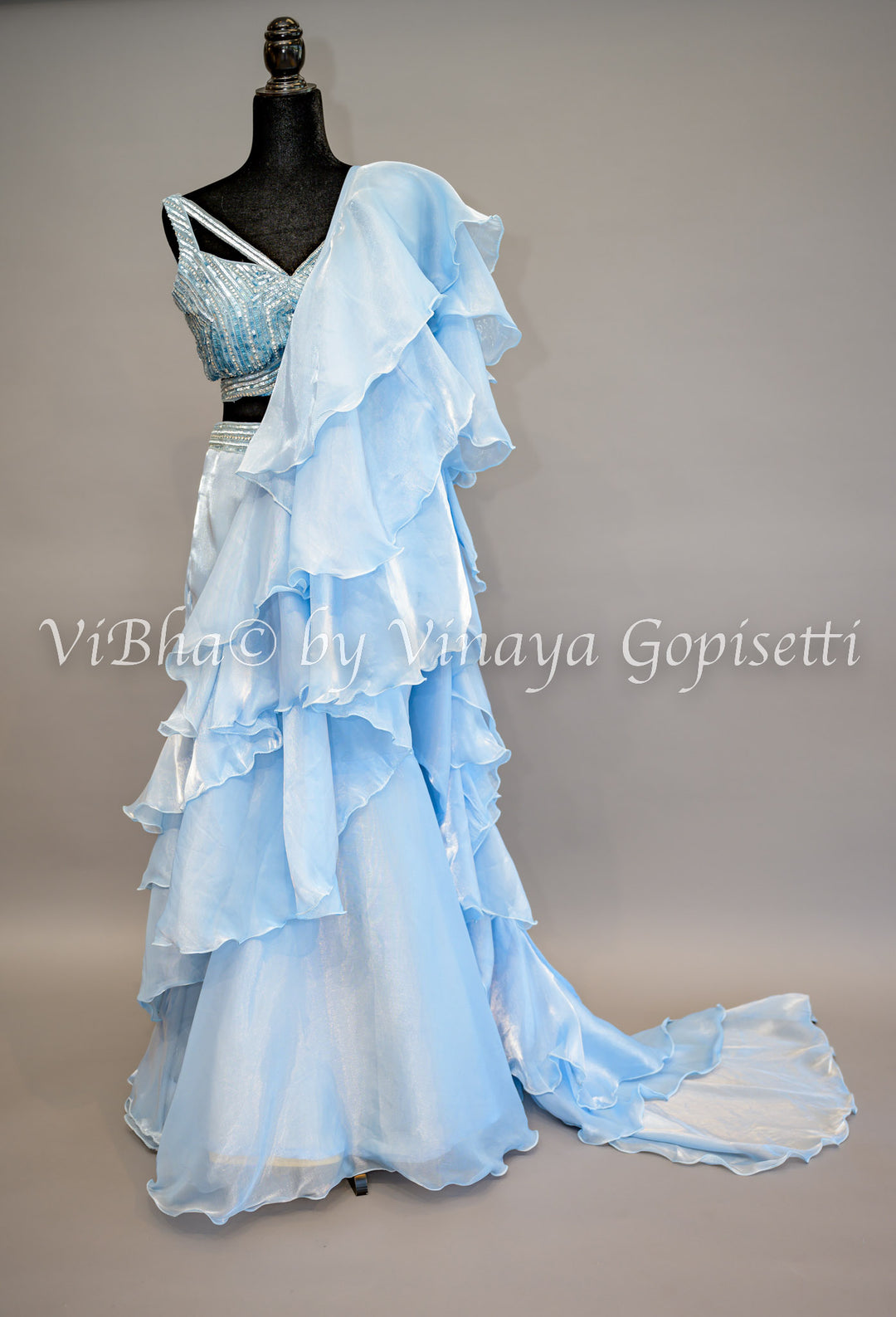 Dazzling luminous designs crusted with sparkles, sequins, crystals, frills, and ruffles!! With a modern twist, each saree from this collection is paired with a unique blouse - creating a mystic and frenetic ensemble.