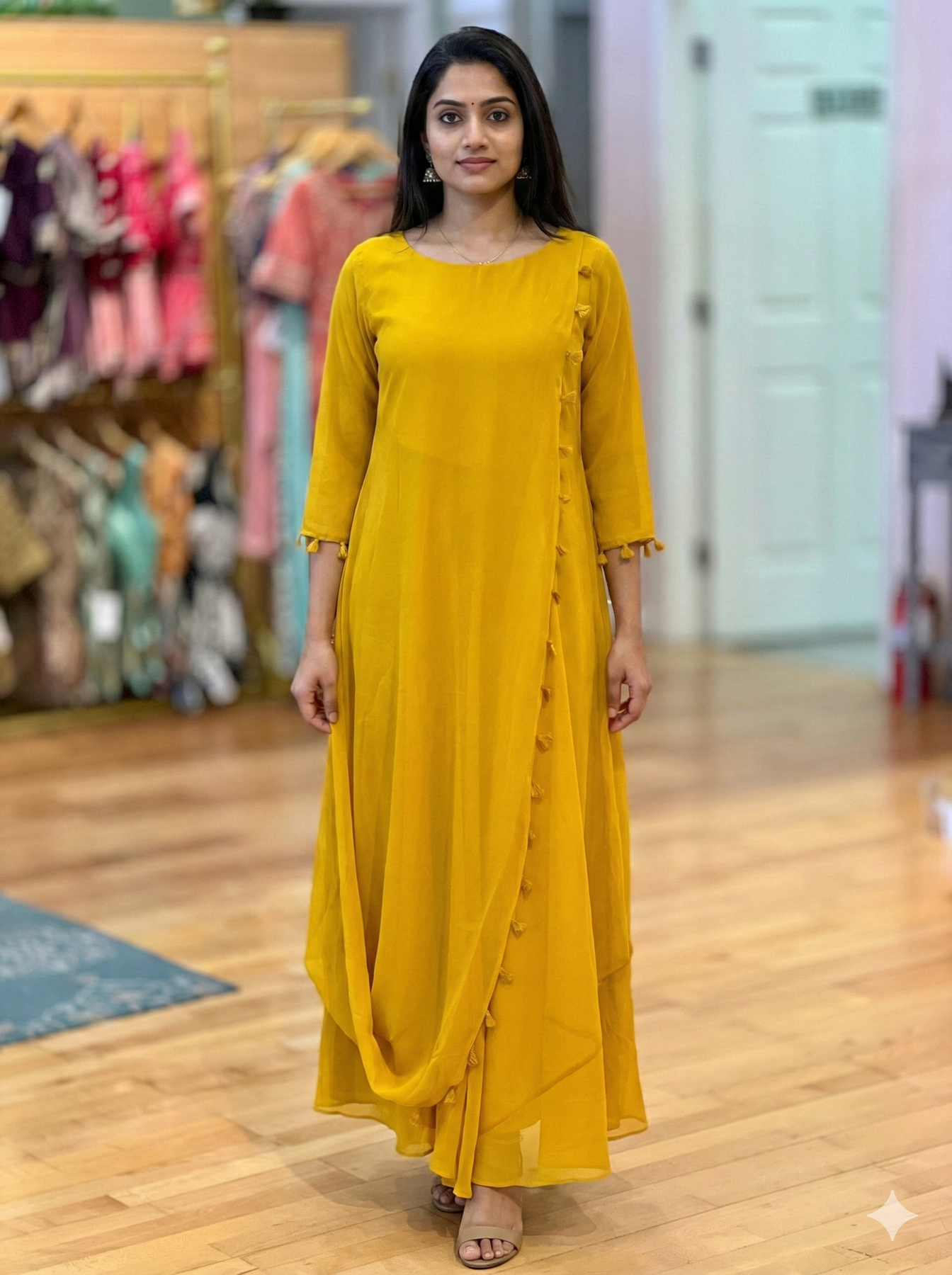 This Mustard Yellow Fusion Gown combines understated sophistication with contemporary flair, ideal for your haldi festivities. Distinctive front cowl pleats add architectural interest to the bodice, creating elegant movement and dimension. The lightweight construction ensures all-day comfort without sacrificing structure or presence. The minimalist design philosophy allows the rich mustard hue to command attention while maintaining versatility for layering with traditional accessories. A refined choice for those seeking modern elegance with cultural resonance.