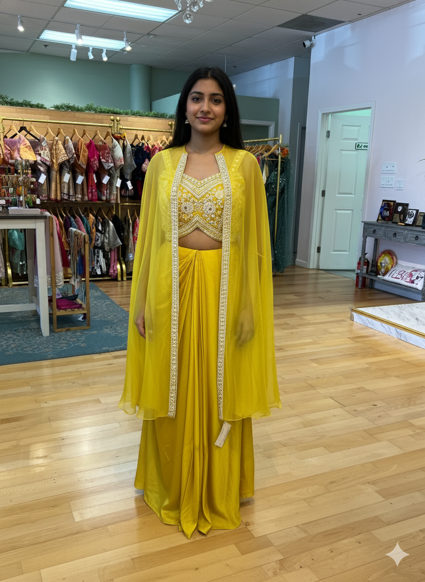 Elevate your ethnic wardrobe with this sophisticated three-piece ensemble. The vibrant yellow draped skirt drapes gracefully for an elegant silhouette, while the intricately embroidered blouse showcases refined craftsmanship and traditional artistry. The coordinating cape adds a dramatic finishing touch, perfect for special occasions, celebrations, or making a refined statement at cultural events. This curated set combines timeless design with contemporary styling, offering versatility for both formal gatherings and festive occasions. An investment piece that celebrates heritage with understated luxury.