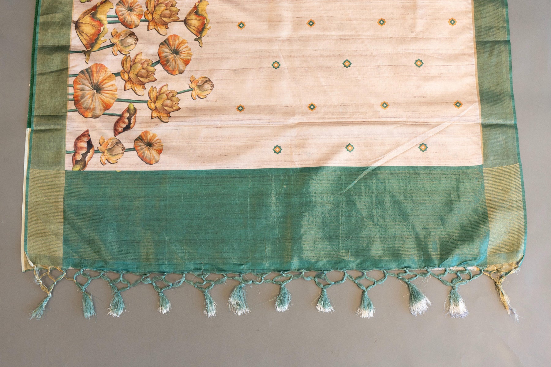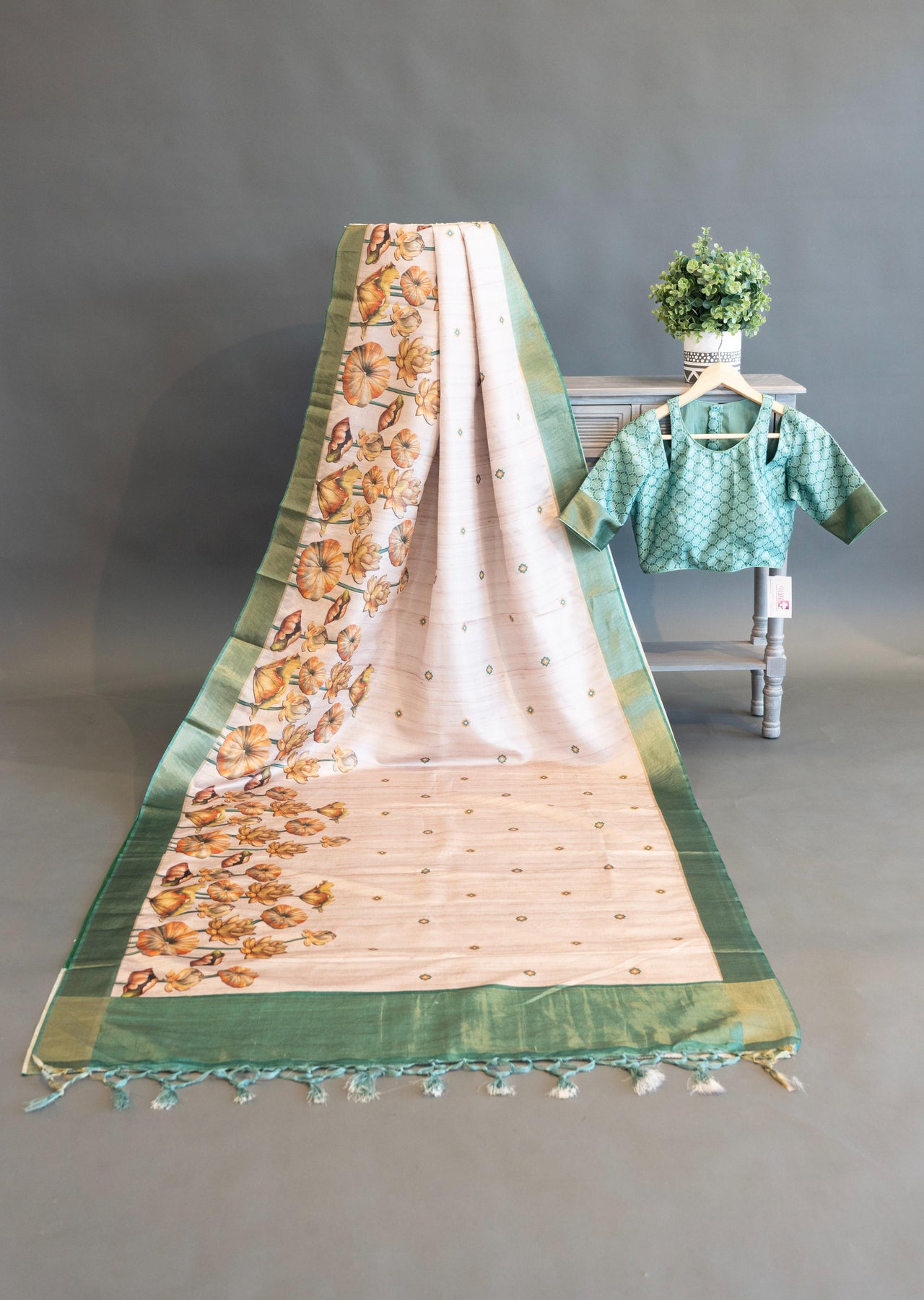 Elevate your ethnic wardrobe with this exquisite tussar silk saree, a timeless choice for those who appreciate refined craftsmanship. The cream and green color palette creates a sophisticated, versatile foundation that complements various skin tones and occasions. Hand-printed floral motifs add artistic depth and visual interest, transforming the fabric into wearable art. Tussar silk's natural texture provides a luxurious drape while maintaining breathability, making it ideal for both festive celebrations and formal gatherings. The coordinated blouse ensures a polished, complete look straight from purchase. This saree represents the perfect balance of traditional elegance and contemporary style, suitable for weddings, receptions, and cultural events.