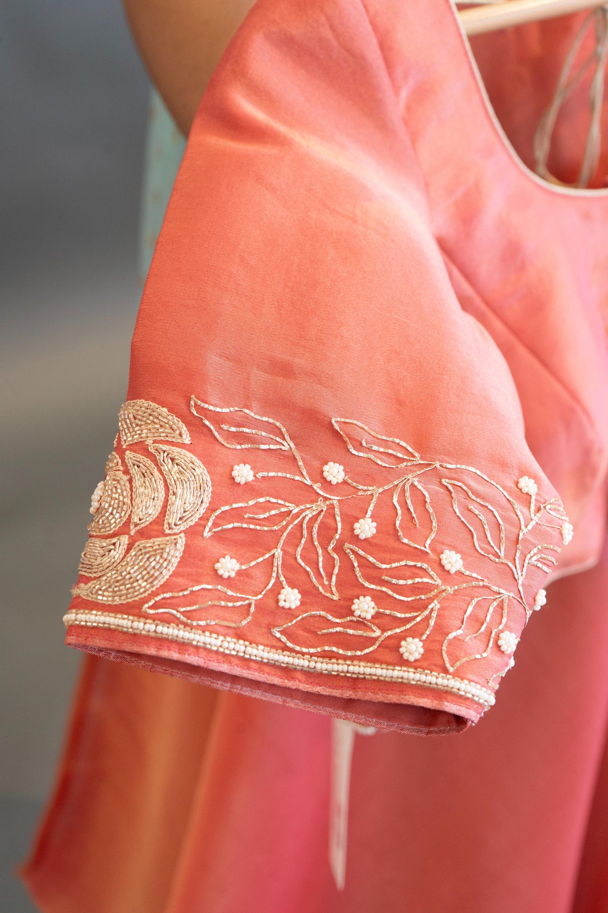 Coral-Pink Tissue-Silk Hand-Embroidered Saree And Blouse