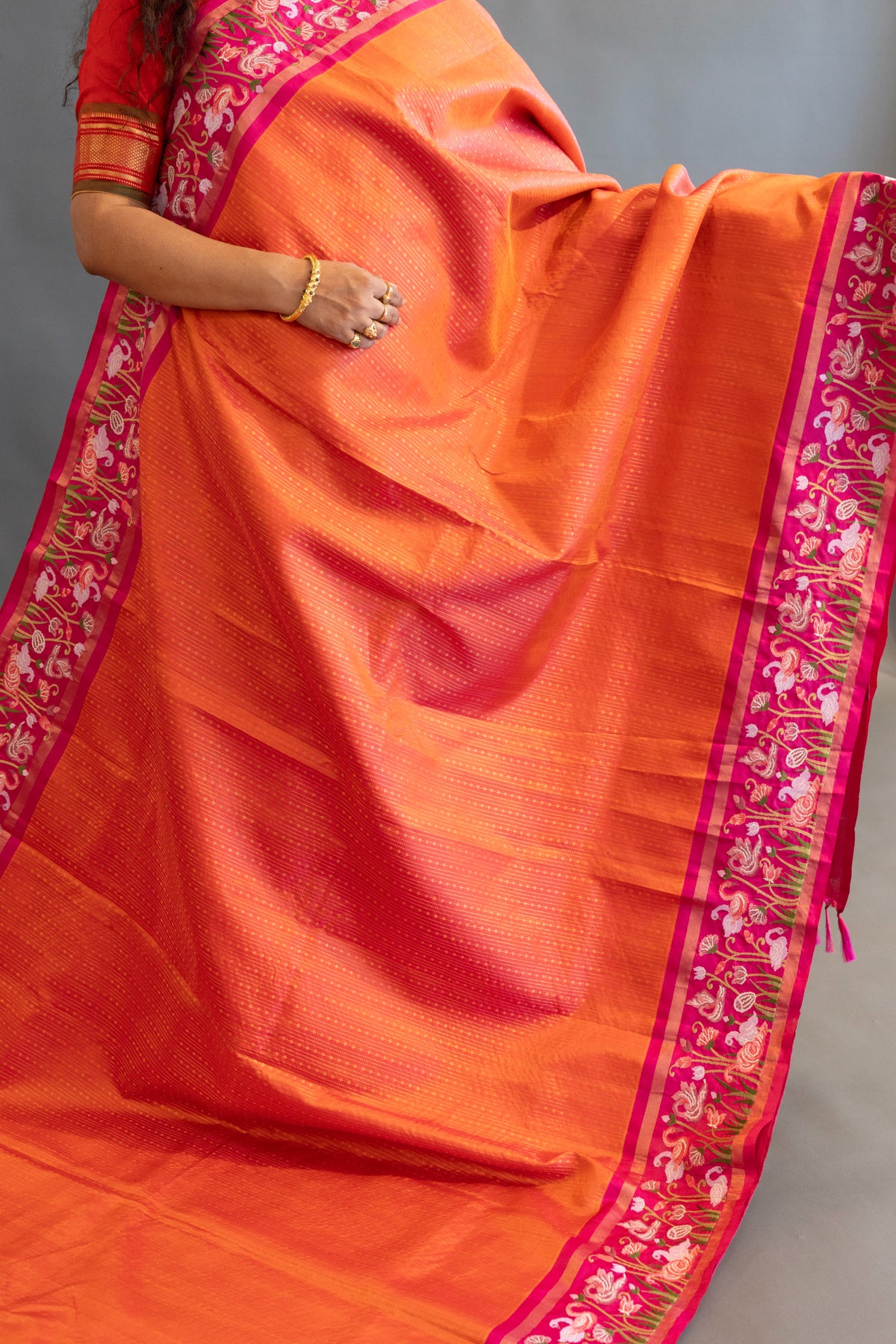 Orange and Pink Kanchi Silk with Petit Point Embroidered Saree and Blouse