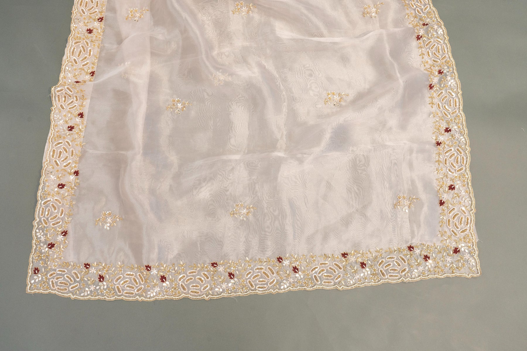 Elevate your ethnic wardrobe with this exquisite pastel mauve organza saree, a masterpiece of refined craftsmanship. The soft, flowing fabric drapes gracefully, creating an ethereal silhouette perfect for weddings, celebrations, and formal occasions. Each piece showcases intricate hand-embroidery detailing that adds depth and sophistication to the ensemble. The coordinating blouse completes the look with seamless elegance. This saree combines traditional artistry with contemporary aesthetics, offering versatility for both classic and modern styling. Ideal for those who appreciate quality textiles and timeless design.