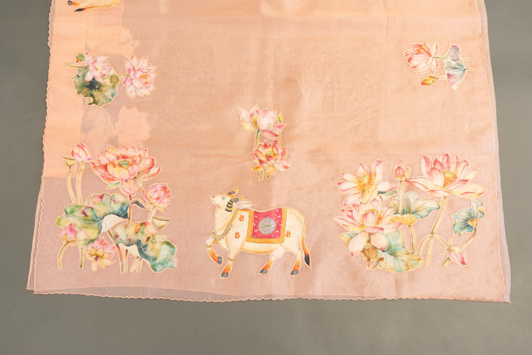 Pastel-Peach Soft Organza Saree And Blouse With Pichwai Work