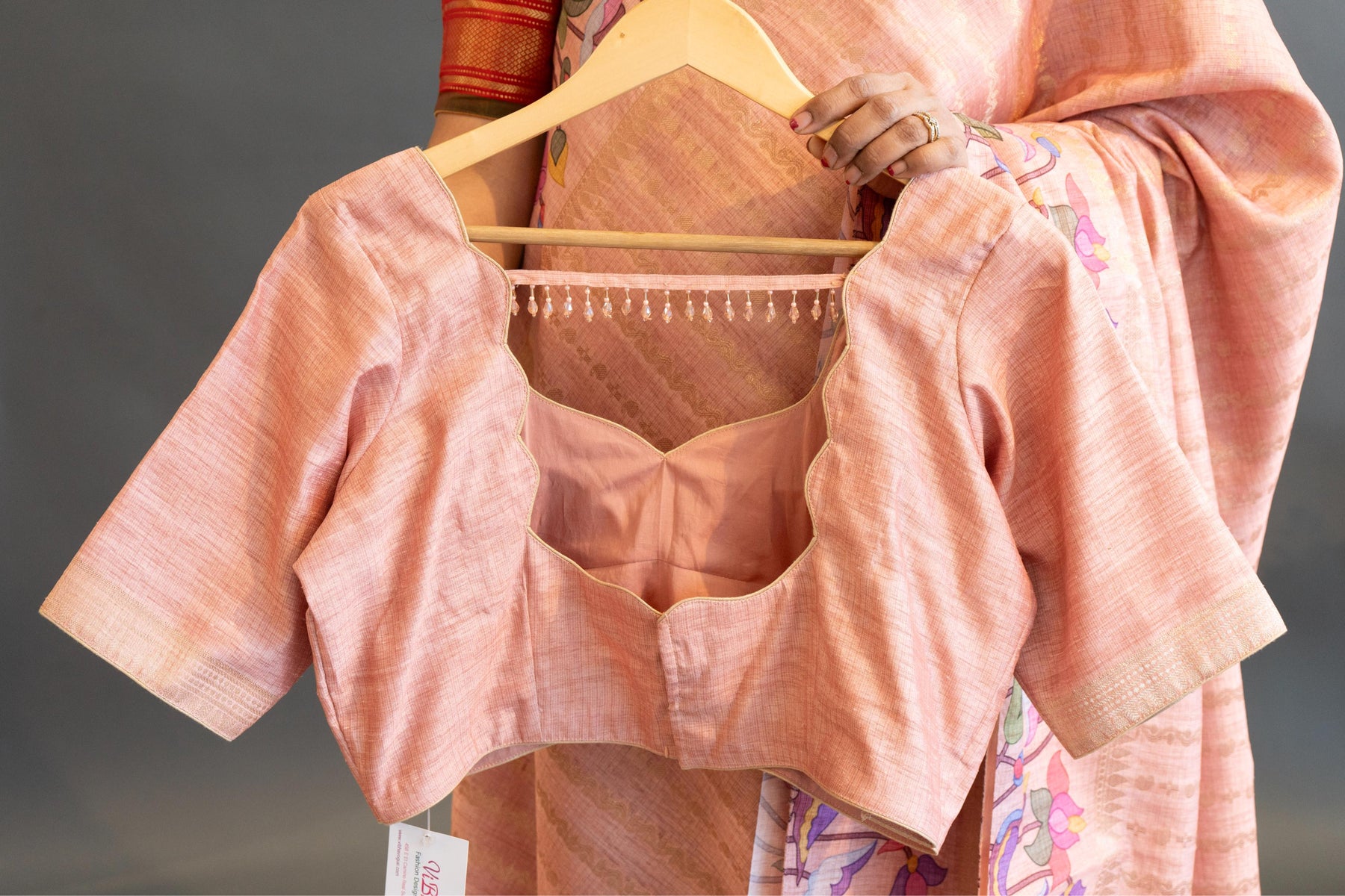 Peach Pink Tussar Silk Saree And Blouse With Paithani Borders