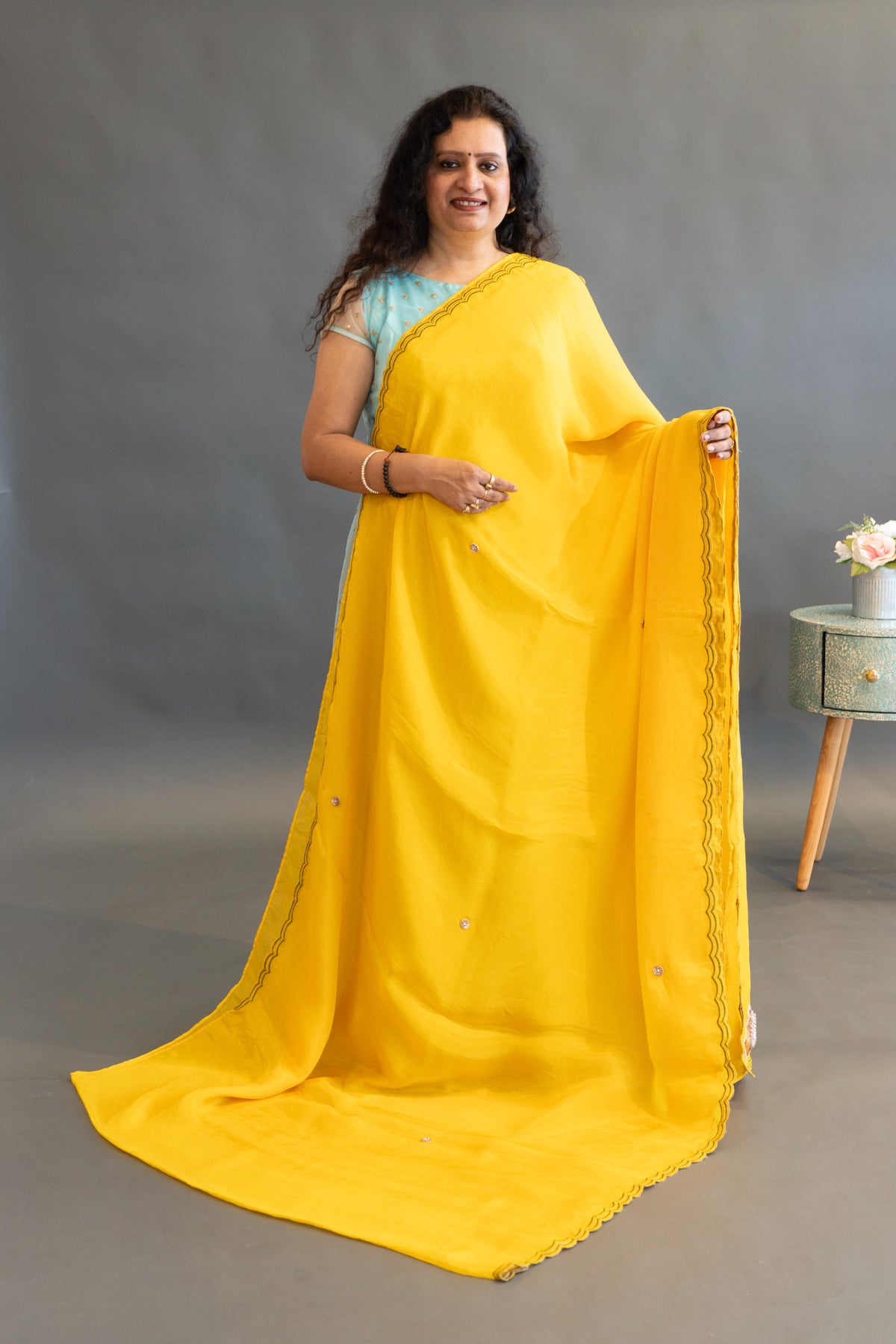 Elevate your ethnic wardrobe with this stunning yellow organza saree, crafted from premium soft fabric that drapes beautifully with an effortless grace. The saree is complemented by an exquisitely designed blouse featuring delicate floral prints and elegant bell sleeves that add a contemporary flair to traditional styling. The lightweight organza construction ensures comfort throughout the day, while the vibrant yellow hue makes a bold statement suitable for festive occasions, celebrations, or formal gatherings. Perfect for those who appreciate refined craftsmanship and timeless elegance with modern touches.
