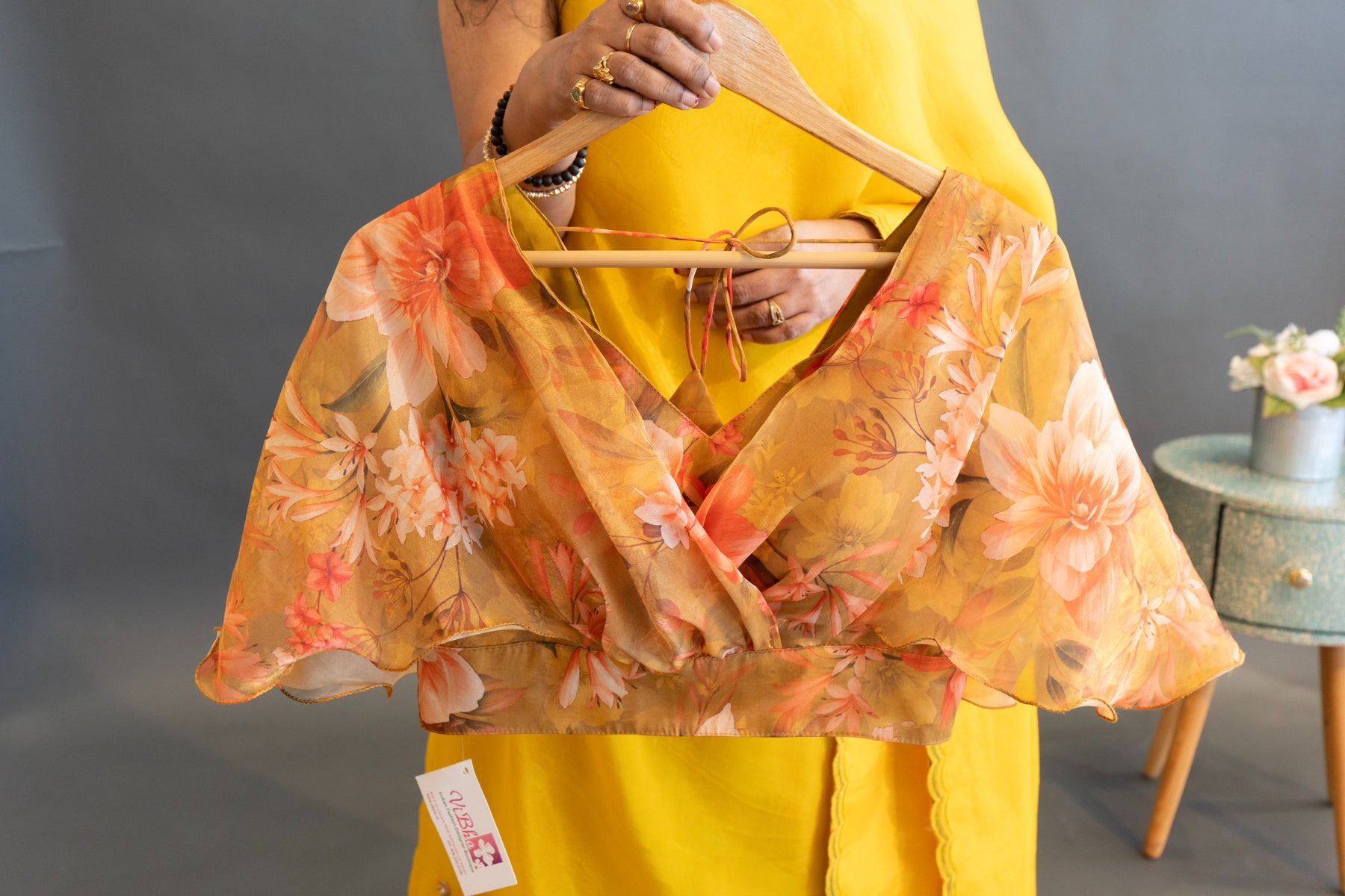 Yellow Soft Organza Saree With Floral-Print Bell-Sleeve Blouse