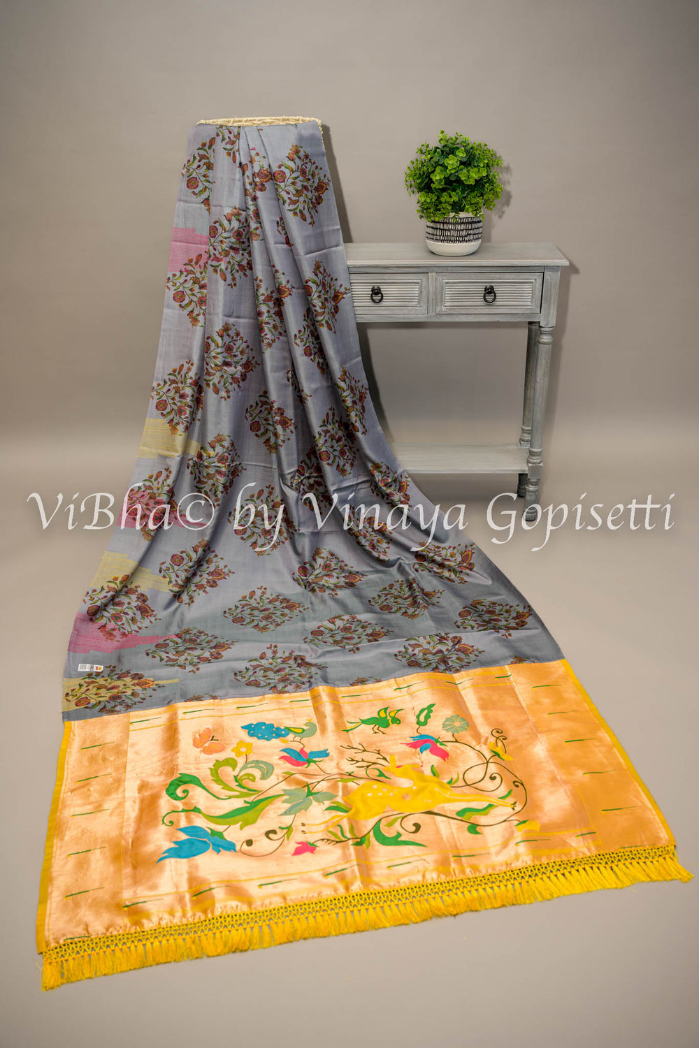 Grey Floral Digital Print Kanchi Soft Silk Saree With Yellow Benares Paithani Pallu And Blouse