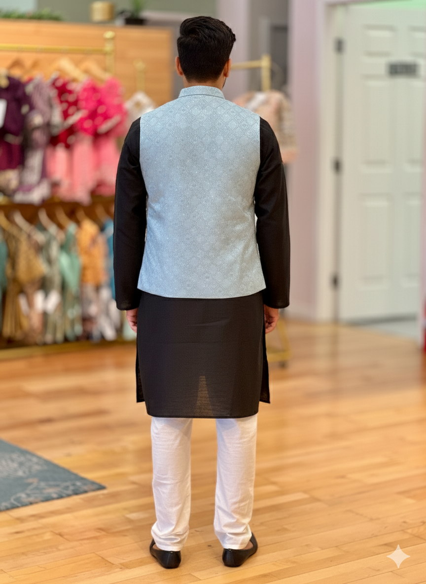 Elevate your ethnic wardrobe with this exquisite Sky Blue Banarasi Brocade Vest, a masterpiece of traditional Indian craftsmanship. Woven with authentic Banarasi brocade, this vest showcases intricate patterns and rich textures that reflect centuries of weaving heritage. The serene sky blue hue offers versatility, pairing seamlessly with traditional kurtas, lehengas, or contemporary separates. The structured brocade fabric provides a refined silhouette while maintaining comfort for extended wear. Perfect for weddings, festivals, or formal occasions, this vest combines timeless elegance with sophisticated style. An investment piece that transcends seasons and trends.