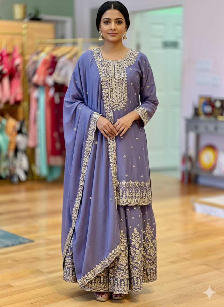 Elevate your wedding wardrobe with this exquisite Iris Color Hand Embroidered Sharara Set. Crafted with meticulous hand embroidery, this ensemble features a stunning wide-leg sharara silhouette paired with an intricately detailed dupatta. The rich embroidery work showcases traditional artistry and refined craftsmanship, creating a sophisticated look that commands attention. Ideal for weddings and special celebrations, this set combines timeless elegance with contemporary styling, ensuring you stand out with grace and poise.