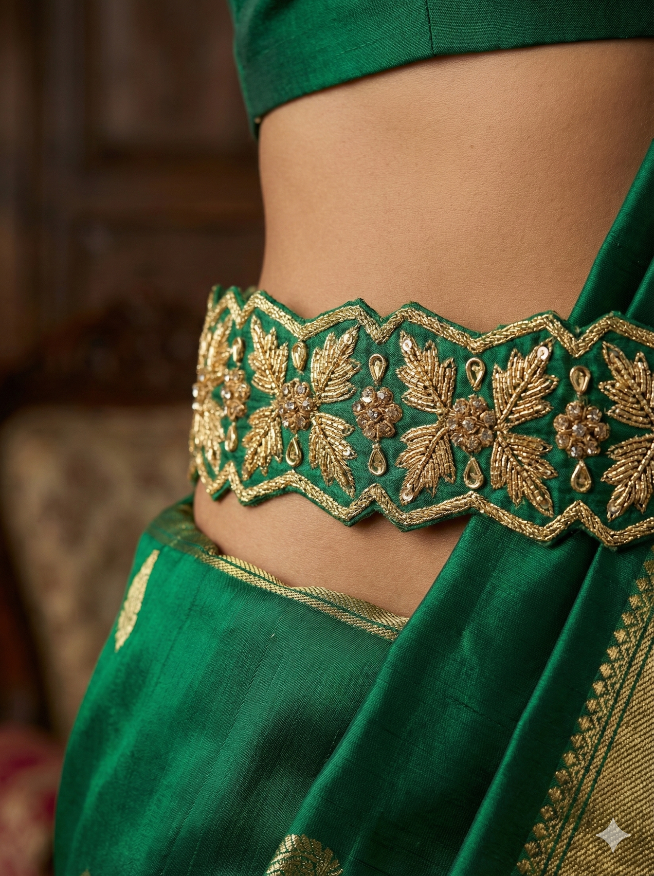 Dark Green Raw Silk Hand Embroidered Waist Belt