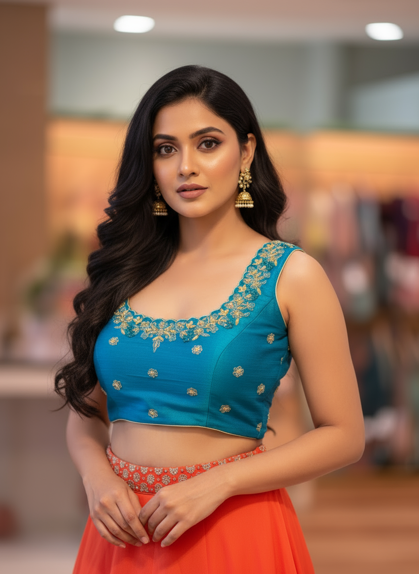 Deep Sky Blue Hand Embroidered Blouse Elevate your wardrobe with this striking deep sky blue blouse, where traditional craftsmanship meets contemporary style. Each piece features intricate hand embroidery, meticulously executed to create dimensional patterns that catch the light beautifully. The rich blue tone offers versatility—pair it with tailored trousers for professional settings or drape it over traditional wear for cultural occasions. The hand-embroidered detailing adds texture and visual interest, making this blouse a statement piece that transcends seasonal trends. Perfect for those who appreciate artisanal quality and distinctive design, this blouse combines comfort with refined elegance.