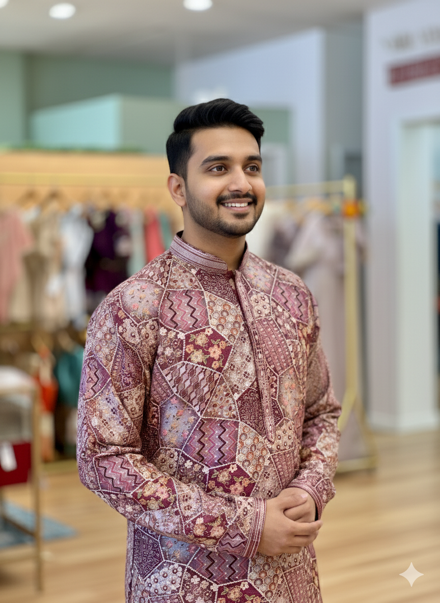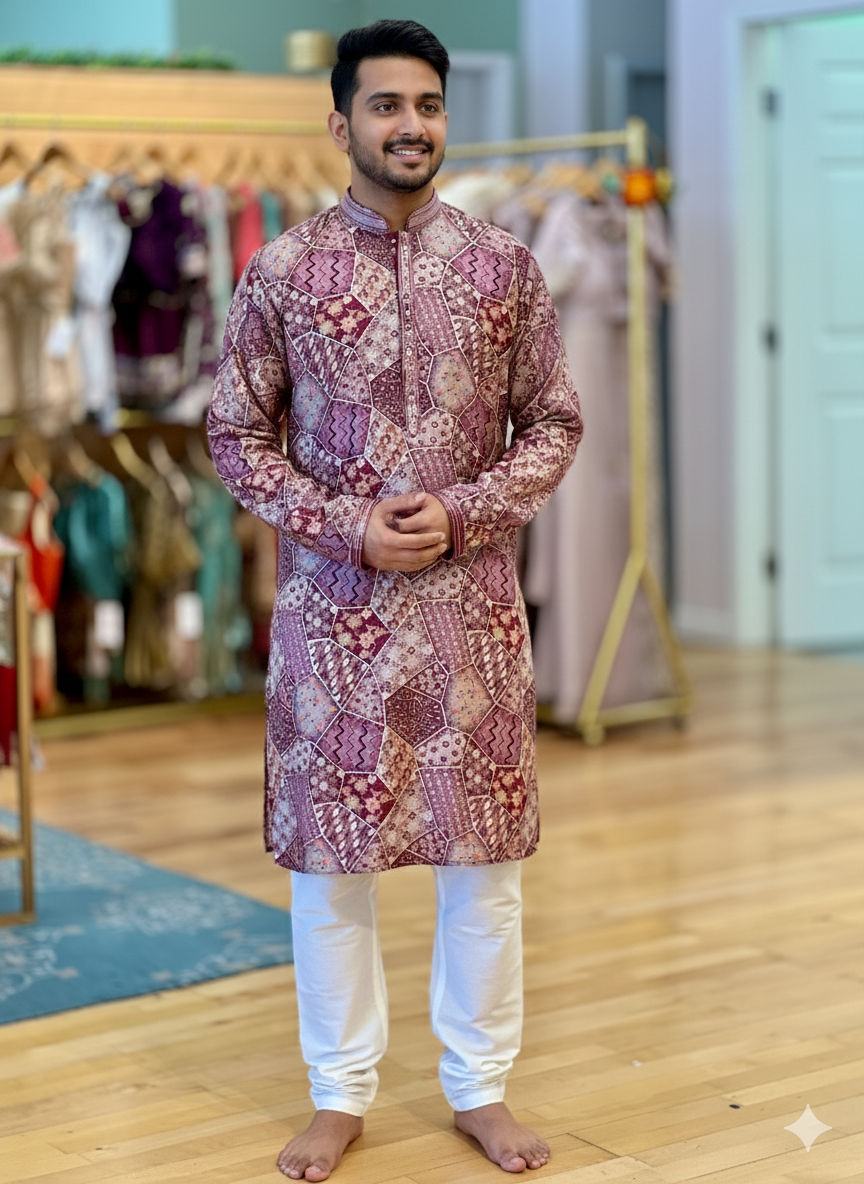 Elevate your ethnic wardrobe with this sophisticated light purple kurta set, where traditional craftsmanship meets contemporary design. The kurta features intricate embroidery work complemented by a refined position print, creating visual depth and cultural elegance. Tailored for comfort and grace, the coordinating pajama ensures a polished, put-together appearance perfect for festive occasions, family gatherings, or everyday wear. The soft purple hue flatters a range of skin tones while maintaining a timeless appeal. Crafted with attention to detail, this ensemble celebrates authentic Indian fashion with modern sensibility.