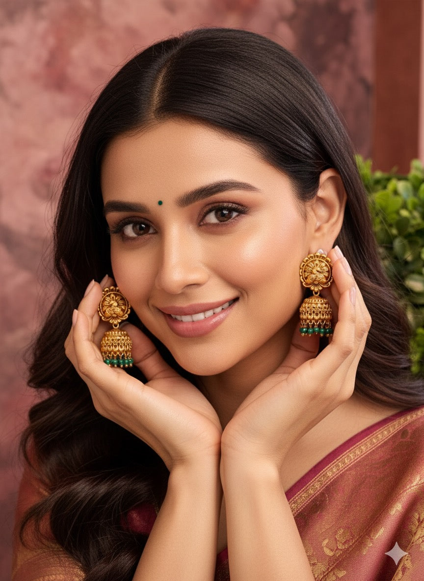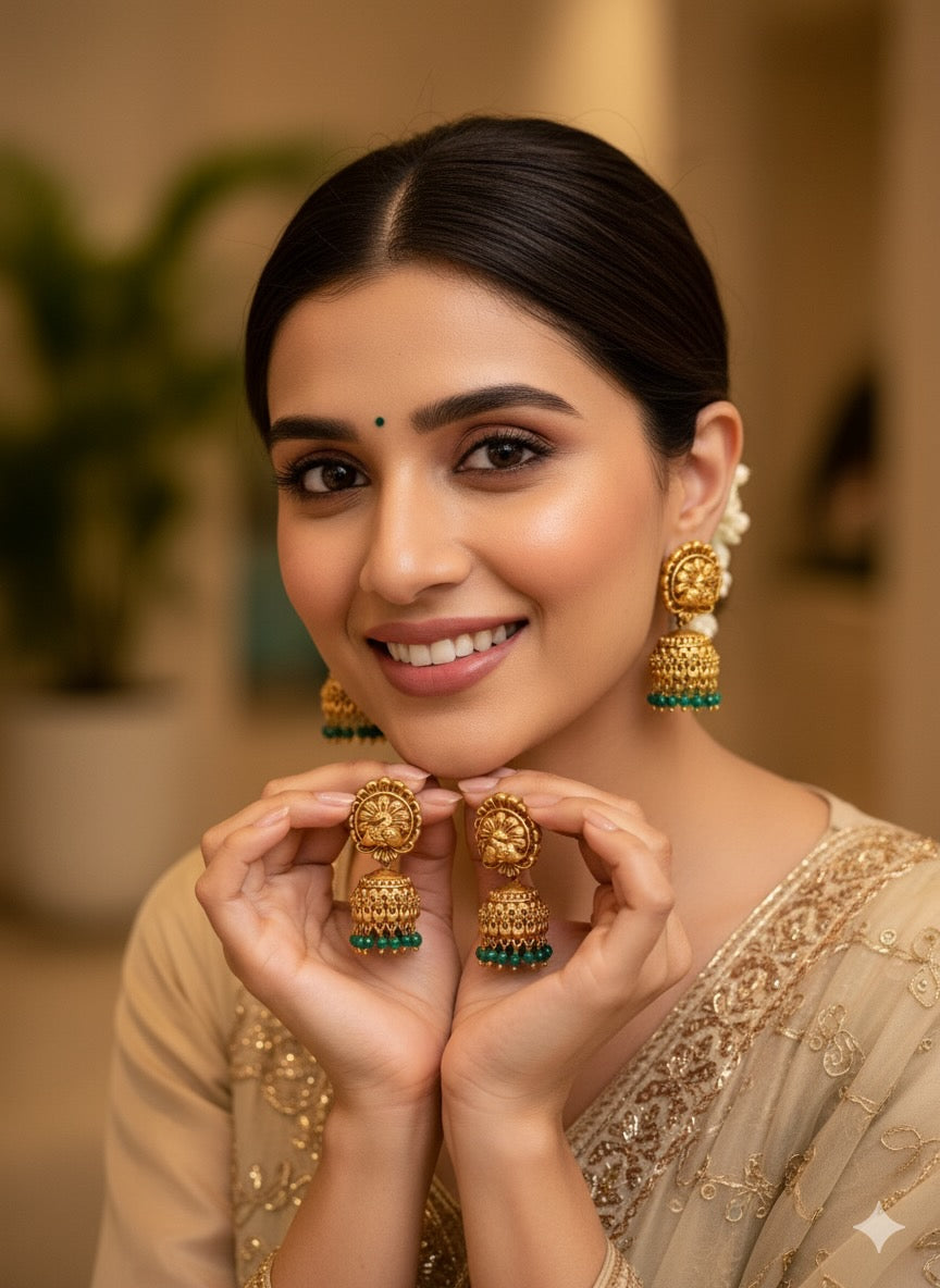 Elegantly crafted peacock design earrings featuring vibrant green beads. These traditional jhumka-style pieces showcase intricate metalwork inspired by the majestic peacock, India's national bird. The dangling green beads add movement and a touch of color, making these earrings perfect for both festive occasions and everyday ethnic wear. Lightweight yet statement-making.