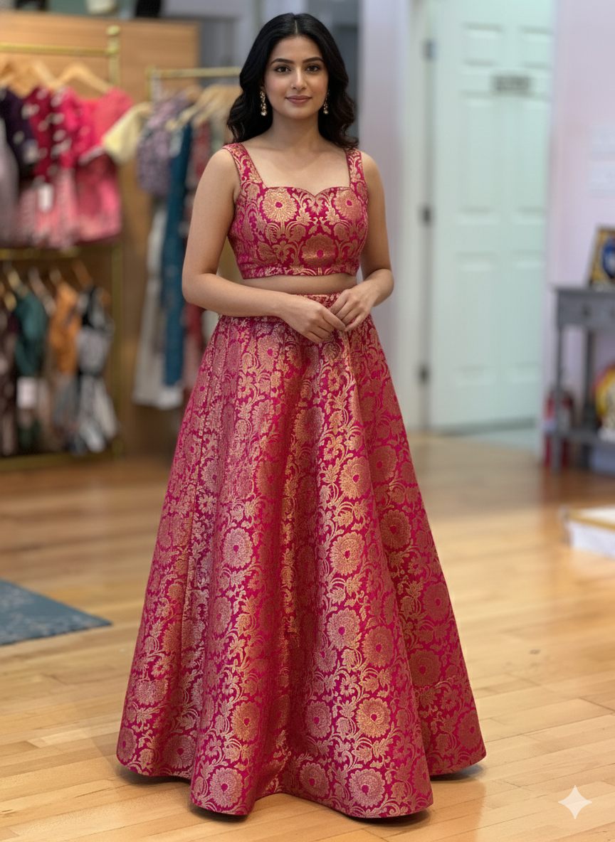 Elevate your ethnic wardrobe with this exquisite Pink Banarasi-Brocade Silk Lehenga set. Crafted from premium silk with intricate brocade detailing, the lehenga features the timeless elegance of Banarasi craftsmanship. The coordinating blouse complements the rich pink hue perfectly, while the crisp white dupatta provides a striking contrast. Ideal for weddings, festivals, and special celebrations, this three-piece ensemble combines traditional artistry with refined sophistication. The luxurious silk fabric drapes beautifully, ensuring comfort and grace throughout your event.