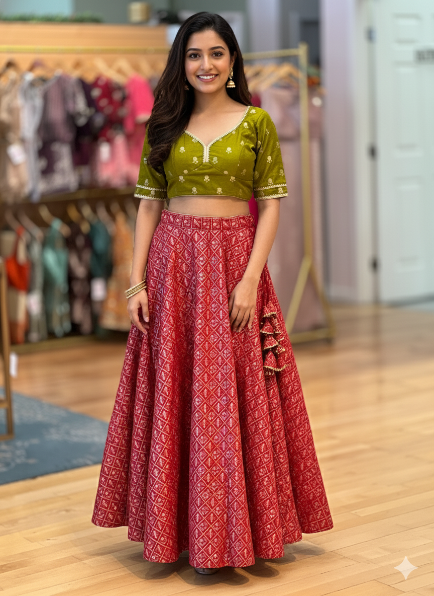 Elevate your ethnic wardrobe with this exquisite Red and Green Banarasi Silk Brocade Lehenga Set. Crafted from authentic Banarasi silk, this ensemble features intricate brocade work that showcases traditional Indian craftsmanship. The striking color combination of deep red and rich green creates a sophisticated, festive look perfect for weddings, celebrations, and special occasions. The set includes a beautifully coordinated gold dupatta that adds an elegant finishing touch. The luxurious silk fabric drapes gracefully, ensuring comfort and a regal appearance. Ideal for those who appreciate timeless ethnic elegance and fine quality textiles.