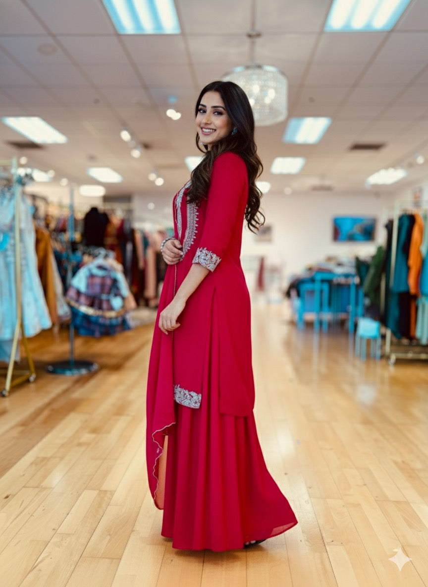 Red Embroidered Sharara Elevate your ethnic wardrobe with this striking red sharara, meticulously crafted with intricate embroidery detailing. The traditional silhouette features a fitted kurta paired with voluminous sharara pants, creating an elegant drape that flatters all body types. Hand-embroidered embellishments showcase exceptional craftsmanship, while the rich red hue commands attention at weddings, celebrations, and formal occasions. Constructed from premium fabric that ensures comfort throughout wear, this ensemble balances timeless tradition with refined sophistication. Perfect for those who appreciate authentic Indian fashion with contemporary appeal.